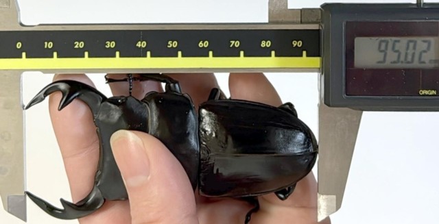 | コメント:(仮測定時より90mmを超えていた個体です) 縮む事なく無事にご覧のサイズとなりました。良い菌糸を有難うございます。今後はギネスに向けて頑張ります。 |