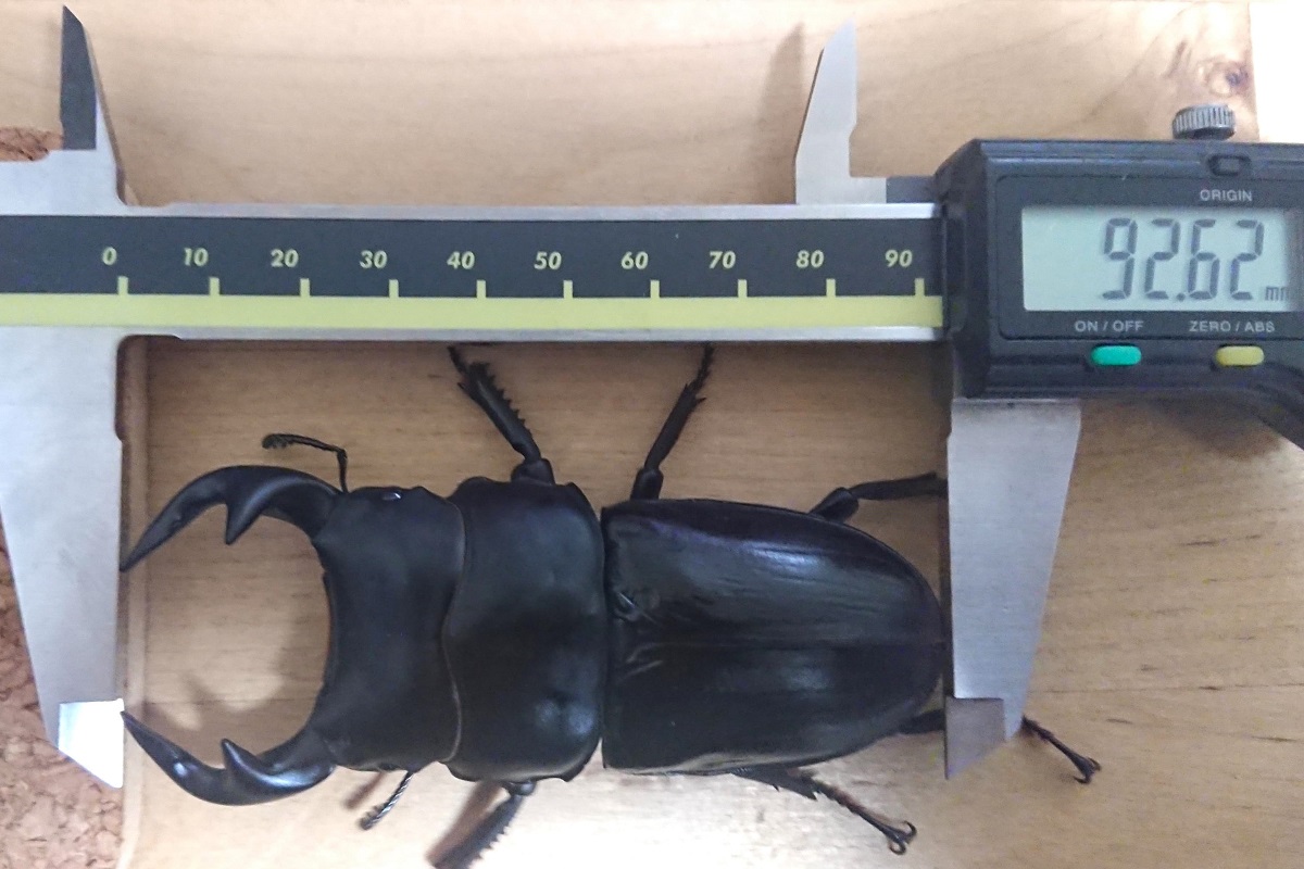 コメント:(仮測定時より90mmを超えていた個体です) 縮む事なく無事にご覧のサイズとなりました。良い菌糸を有難うございます。今後はギネスに向けて頑張ります。 |