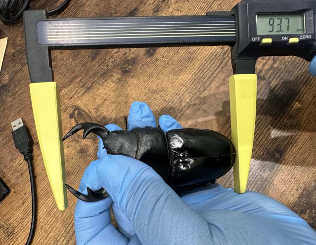 コメント: 虫をノギスで測るのは難しいですね!すぐ動くので苦労しました。良い個体です。 良い血統なんですね、自己記録更新です。 |