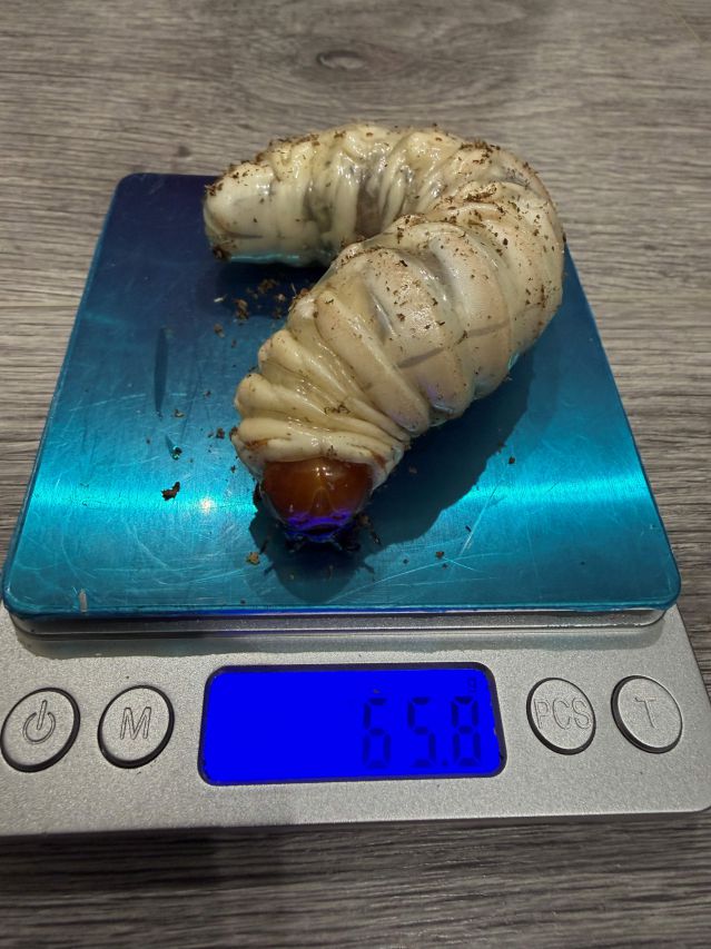 お客様のところより65.8gの幼虫が出現しています。 飼育データ 1本目:2025年7月18日 Grand-Grow 菌糸カップ 2本目:2025年10月21日 Grand-Master 2300cc 幼虫体重18.5g 3本目:2026年2月1日 Grand-Master 2000cc 幼虫体重65.8g |